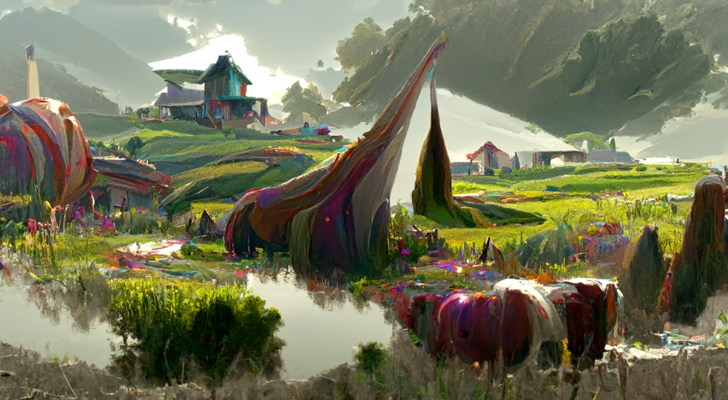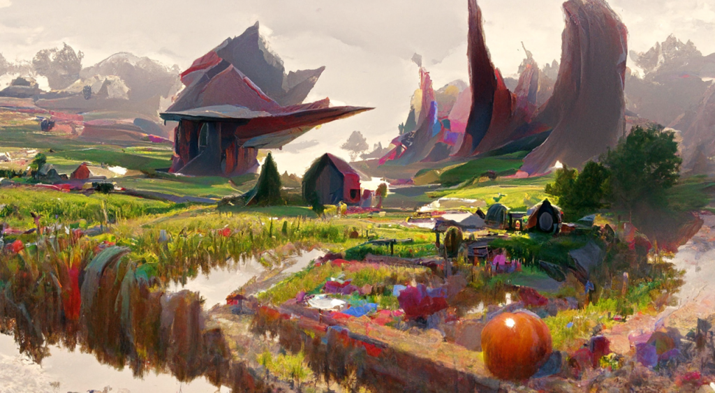 prompts:”An expansive view of idyllic and pastoral landscape,a magic style mushroom farmhouse in farm,green crops in farm,cherry trees around farm”, “Trending on artstation”
